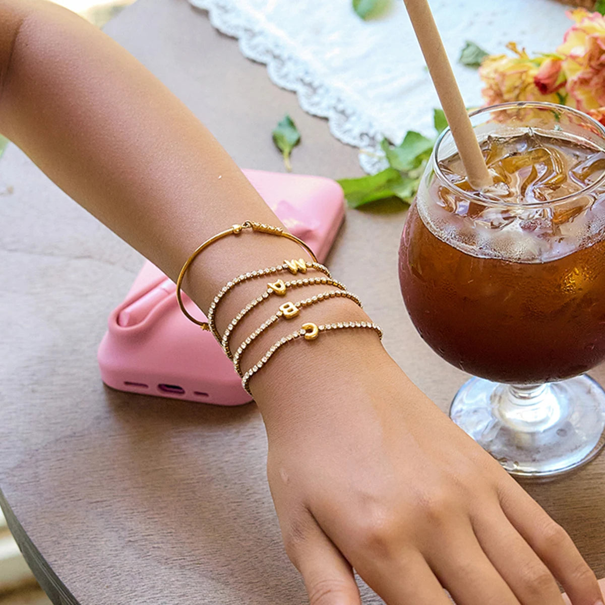 Elevate your everyday look with the NORÉLI Initial Glow Bracelet, a delicate piece designed to celebrate individuality and timeless elegance. Featuring sparkling white rhinestones and a personalized initial charm, this bracelet blends minimal luxury with meaningful style.