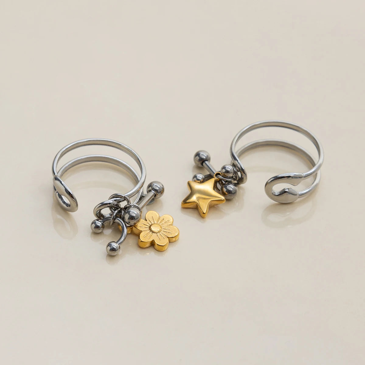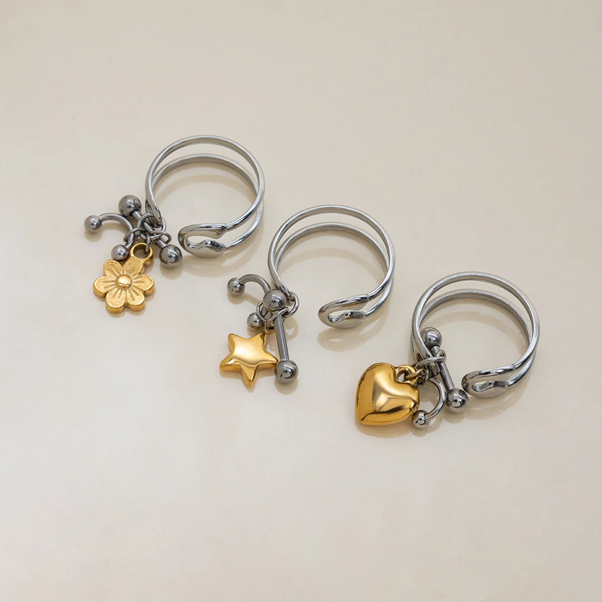 Zora Trendy Women's Paper Clip Design Flower Heart Star Pendant Open Ring 18K Gold-plated Stainless Steel Waterproof Jewelry